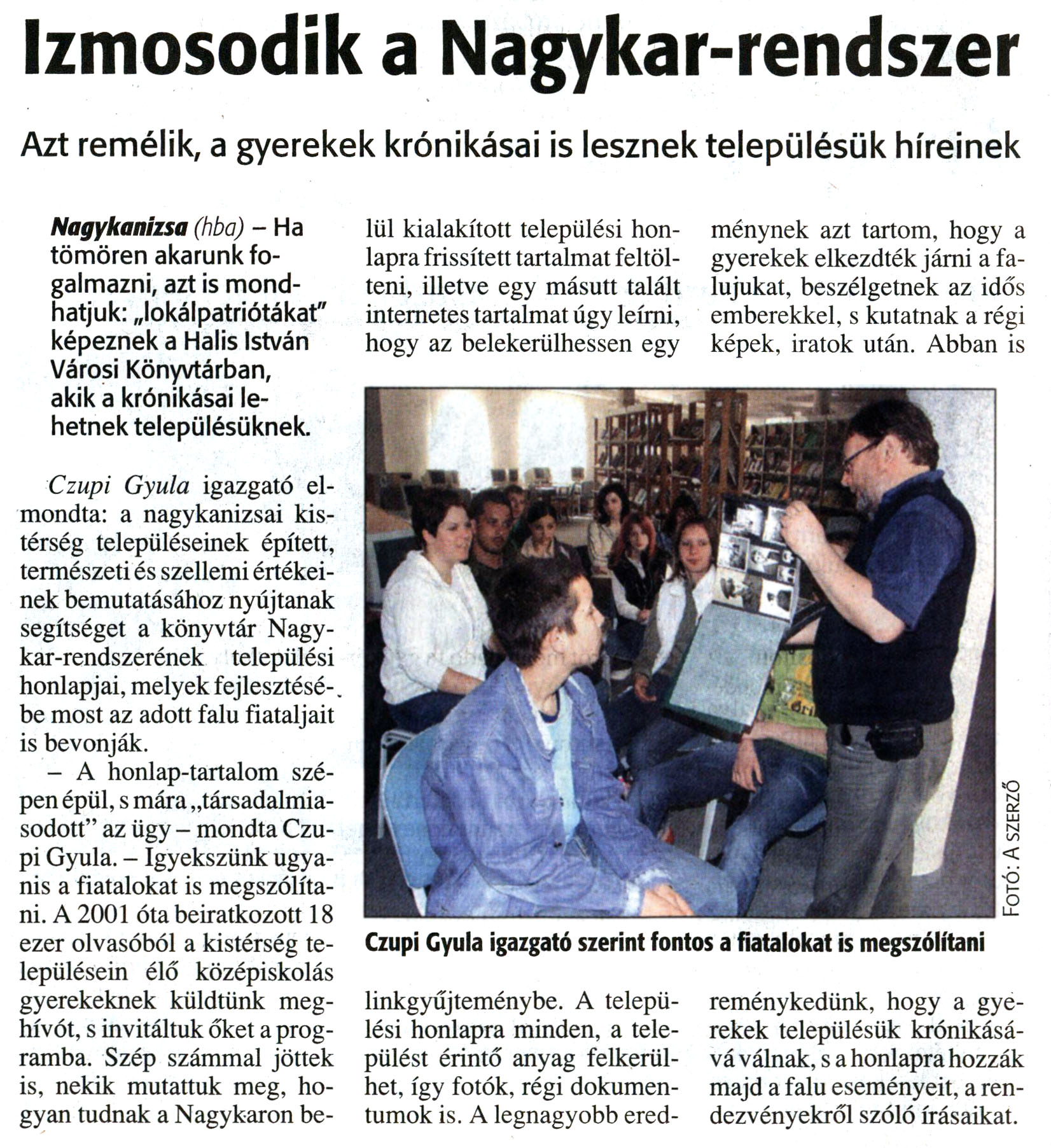 Nyilvános 14308 | 28550 | Zalai Hírlap 2008. június 9. 133. szám 12. oldal - Izmosodik a Nagykar-rendszer | A cikk szövege: Izmosodik a Nagykar-rendszer Azt remélik, a gyerekek krónikásai is lesznek településük híreinek Nagykanizsa (hba) - Ha tömören akarunk fogalmazni, azt is mondhatjuk: „lokálpatriótákat" képeznek a Halis István Városi Könyvtárban, akik a krónikásai lehetnek településüknek. Czupi Gyula igazgató elmondta: a nagykanizsai kistérség településeinek épített, természeti és szellemi értékeinek bemutatásához nyújtanak segítséget a könyvtár Nagykar-rendszerének települési honlapjai, melyek fejlesztésébe most az adott falu fiataljait is bevonják. - A honlap-tartalom szépen épül, s mára „társadalmiasodott" az ügy - mondta Czupi Gyula. - Igyekszünk ugyanis a fiatalokat is megszólítani. A 2001 óta beiratkozott 18 ezer olvasóból a kistérség településein élő középiskolás gyerekeknek küldtünk meghívót, s invitáltuk őket a programba. Szép számmal jöttek is, nekik mutattuk meg, hogyan tudnak a Nagykaron belül kialakított települési honlapra frissített tartalmat feltölteni, illetve egy másutt talált internetes tartalmat úgy leírni, hogy az belekerülhessen egy linkgyűjteménybe. A települési honlapra minden, a települést érintő anyag felkerülhet, így fotók, régi dokumentumok is. A legnagyobb eredménynek azt tartom, hogy a gyerekek elkezdték járni a falujukat, beszélgetnek az idős emberekkel, s kutatnak a régi képek, iratok után. Abban is reménykedünk, hogy a gyerekek településük krónikásává válnak, s a honlapra hozzák majd a falu eseményeit, a rendezvényekről szóló írásaikat. Képaláírás: Czupi Gyula igazgató szerint fontos a fiatalokat is megszólítani |