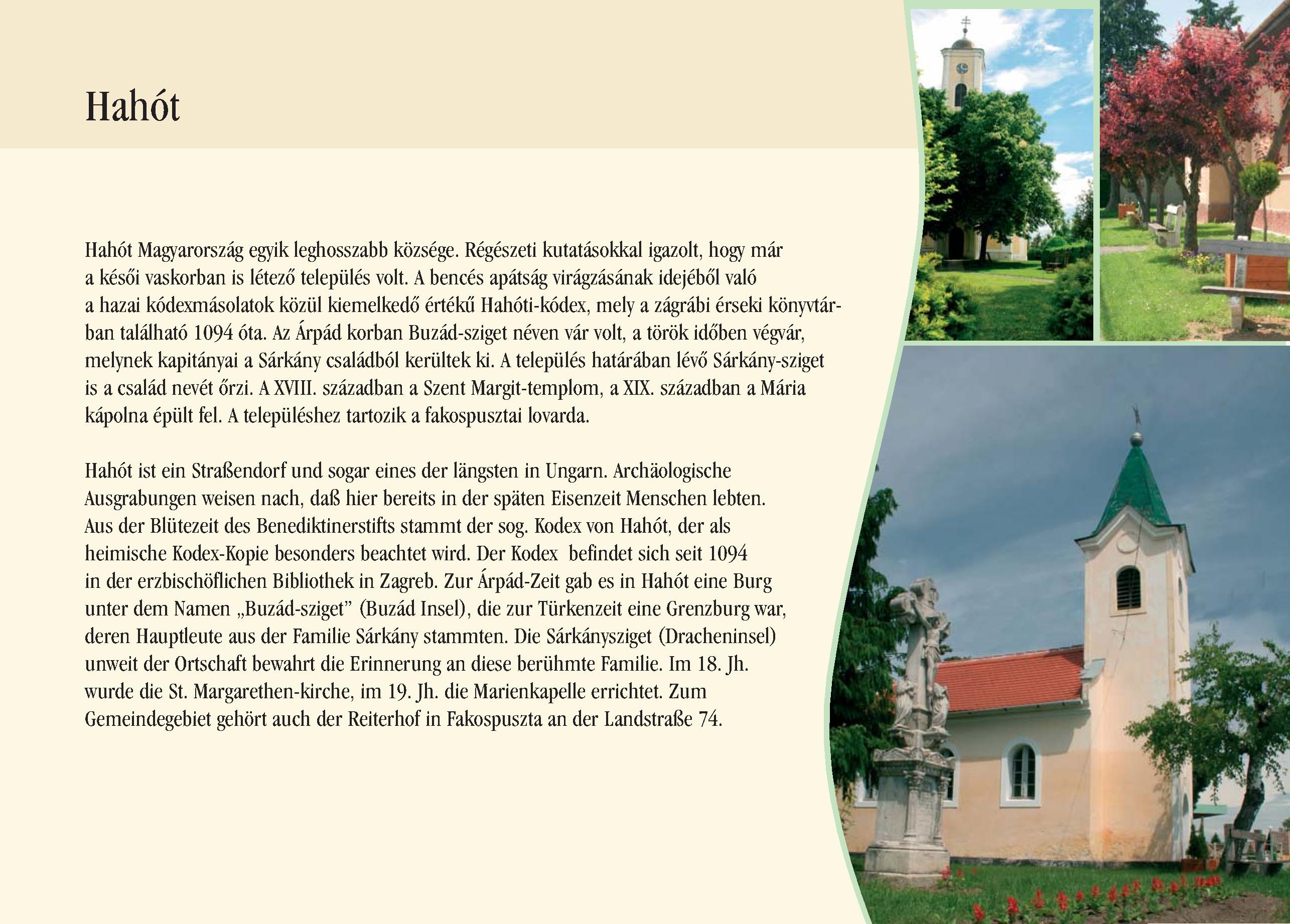 Nyilvános 2371 | 6964 | Hahót | Hahót ist ein Straßendorf und sogar eines der längsten in Ungarn. Archäologische Ausgrabungen weisen nach, daß hier bereits in der späten Eisenzeit Menschen lebten. Aus der Blütezeit des Benediktinerstifts stammt der sog. Kodex von Hahót, der als heimische Kodex-Kopie besonders beachtet wird. Der Kodex befindet sich seit 1094 in der erzbischöflichen Bibliothek in Zagreb. Zur Árpád-Zeit gab es in Hahót eine Burg unter dem Namen ,,Buzád-sziget" (Buzád Insel), die zur Türkenzeit eine Grenzburg war, deren Hauptleute aus der Familie Sárkány stammten. Die Sárkánysziget (Dracheninsel) unweit der Ortschaft bewahrt die Erinnerung an diese berühmte Familie. Im 18. Jh. wurde die St. Margarethen-kirche, im 19. Jh. die Marienkapelle errichtet. Zum Gemeindegebiet gehört auch der Reiterhof in Fakospuszta an der Landstraße 74. Dieses Text stammt von: Pannonhát tájpark prospektus 2006. Web: http://www.pannonhat.hu/ (auch in Deutsch) |