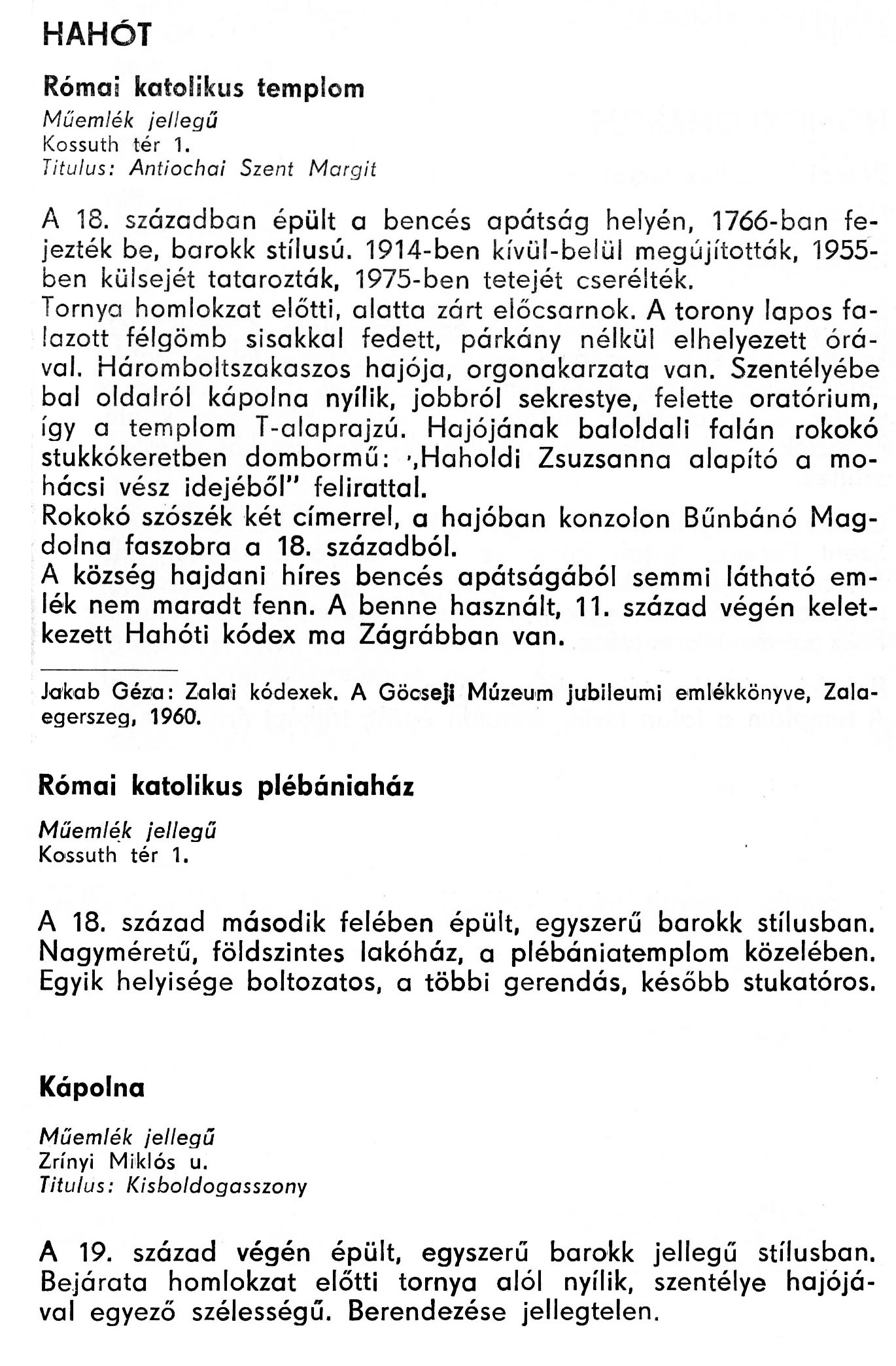 Nyilvános 2309 | 6109 | Hahót - Zala megye műemlékei 1977 059-060old | A részlet szövege: HAHÓT Római katolikus templom Műemlék jellegű Kossuth tér 1. Titulus: Antiochai Szent Margit A 18. században épült a bencés apátság helyén, 1766-ban fejezték be, barokk stílusú. 1914-ben kívül-belül megújították, 1955-ben külsejét tatarozták, 1975-ben tetejét cserélték. Tornya homlokzat előtti, alatta zárt előcsarnok. A torony lapos falazott félgömb sisakkal fedett, párkány nélkül elhelyezett órával. Háromboltszakaszos hajója, orgonakarzata van. Szentélyébe bal oldalról kápolna nyílik, jobbról sekrestye, felette oratórium, így a templom T-alaprajzú. Hajójának baloldali falán rokokó stukkókeretben dombormű: "Haholdi Zsuzsanna alapító a mohácsi vész idejéből" felirattal. Rokokó szószék két címerrel, a hajóban konzolon Bűnbánó Magdolna faszobra a 18. századból. A község hajdani híres bencés apátságából semmi látható emlék nem maradt fenn. A benne használt, 11. század végén keletkezett Hahóti kódex ma Zágrábban van. Jakab Géza: Zalai kódexek. A Göcseji Múzeum jubileumi emlékkönyve, Zalaegerszeg, 1960. Római katolikus plébániaház Műemlék jellegű Kossuth tér 1. A 18. század második felében épült, egyszerű barokk stílusban. Nagyméretű, földszintes lakóház, a plébániatemplom közelében. Egyik helyisége boltozatos, a többi gerendás, később stukatóros. Kápolna Műemlék jellegű Zrínyi Miklós u. Titulus: Kisboldogasszony A 19. század végén épült, egyszerű barokk jellegű stílusban. Bejárata homlokzat előtti tornya alól nyílik, szentélye hajójával egyező szélességű. Berendezése jellegtelen. A részlet a következő könyvből származik: Cím: Zala megye műemlékei Szerző: Németh József (1928) Közreműködő: Lantos Miklós (fotó) Szerz. közl.: Németh József ; [fotók... Lantos Miklós] Kiadás: Zalaegerszeg : Zalai Ny., 1977 ETO jelzet: 72(439.121) ; 7.025.3/.4 ; 908.439.121 Tárgyszó: Zala megye Szakjelzet: 908 Cutter: N 53 Nyelv: magyar Oldalszám: 109 p. |